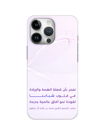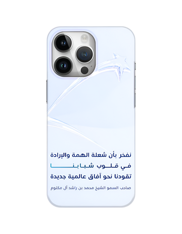 The exclusive phone case design captures the spirit of ambition and possibility. A luminous shooting star arcs across a high-gloss finish: a symbol of youth on the rise, moving boldly toward the future. At its heart is a powerful quote by His Highness Sheikh Mohammed bin Rashid Al Maktoum, celebrating the energy, determination, and global aspirations of the next generation.