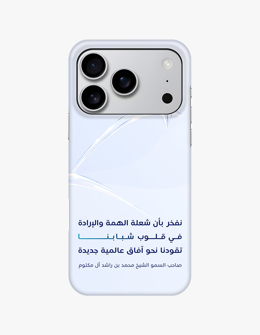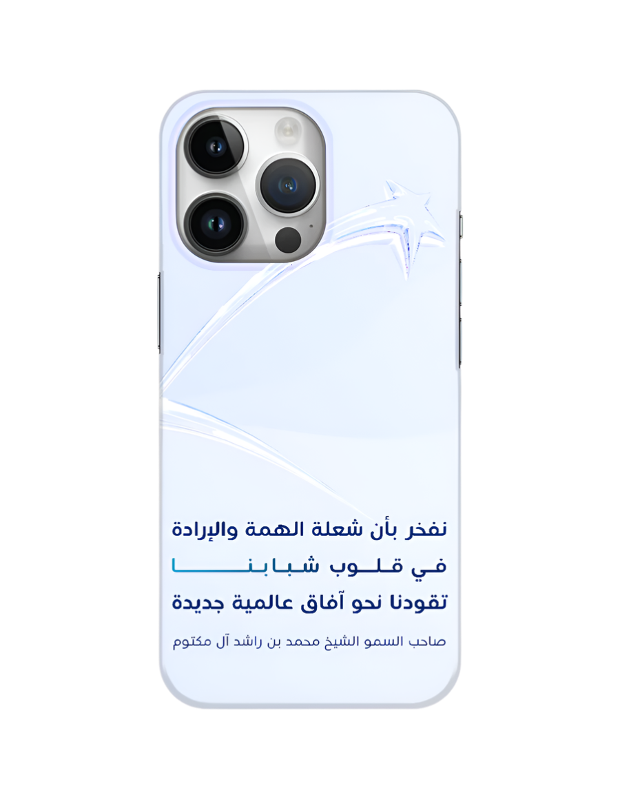 The exclusive phone case design captures the spirit of ambition and possibility. A luminous shooting star arcs across a high-gloss finish: a symbol of youth on the rise, moving boldly toward the future. At its heart is a powerful quote by His Highness Sheikh Mohammed bin Rashid Al Maktoum, celebrating the energy, determination, and global aspirations of the next generation.