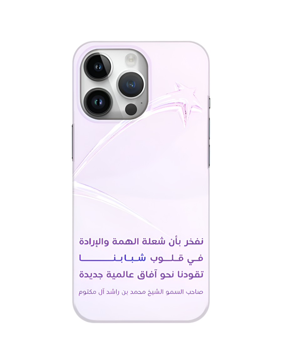 The exclusive phone case design captures the spirit of ambition and possibility. A luminous shooting star arcs across a high-gloss finish: a symbol of youth on the rise, moving boldly toward the future. At its heart is a powerful quote by His Highness Sheikh Mohammed bin Rashid Al Maktoum, celebrating the energy, determination, and global aspirations of the next generation.