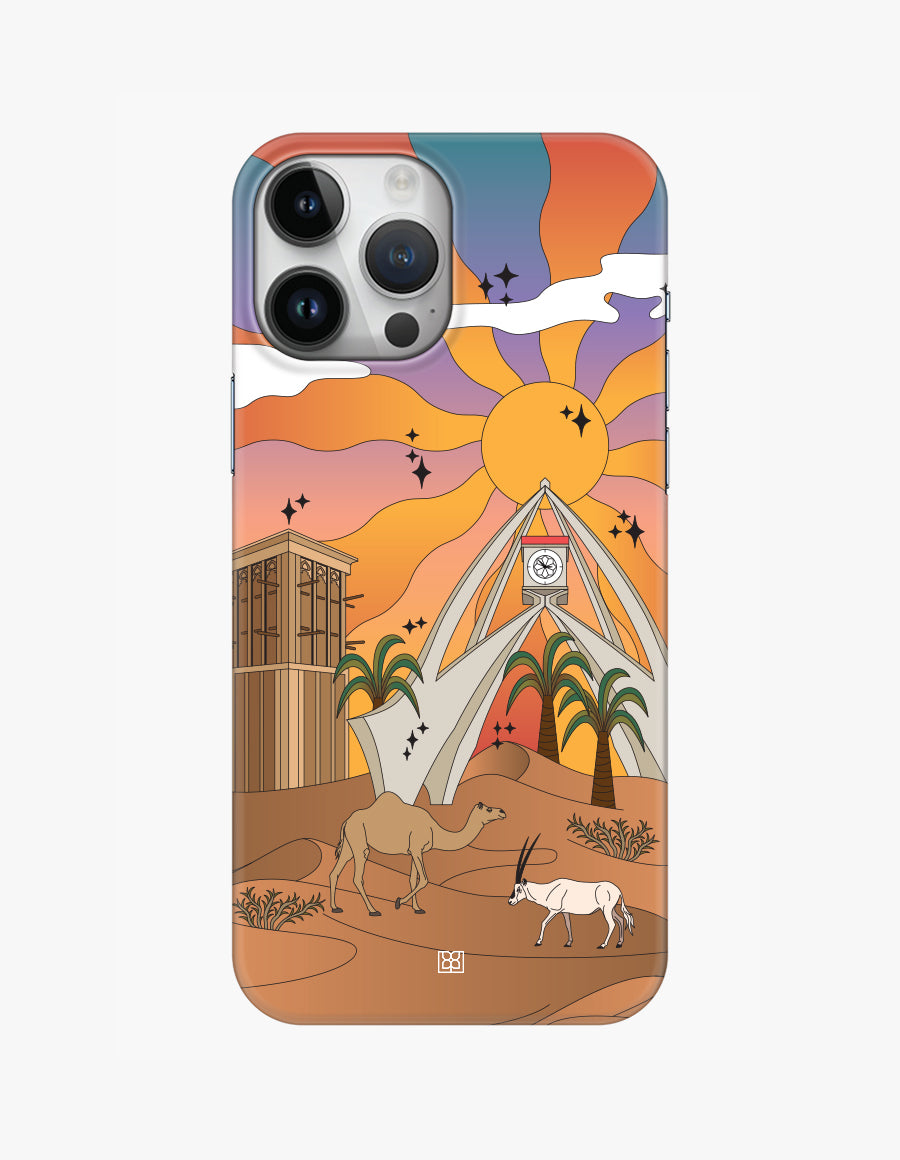 The Sunrise piece represents our roots and traditional Dubai through the serene sunrise over the iconic Deiras clock tower. We celebrate our heritage by incorporating elements such as the wind tower, palm trees, a camel and oryx across the sandy dunes.