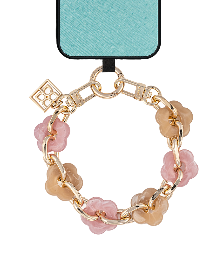 Add a touch of luxury and playful charm to your daily essentials with the LANÉJ Wristlet— a stylish multifunctional accessory designed to keep your phone close or to add charm to your bag! Crafted with eye-catching floral resin links and premium gold hardware, this wristlet is the perfect blend of elegance and function.