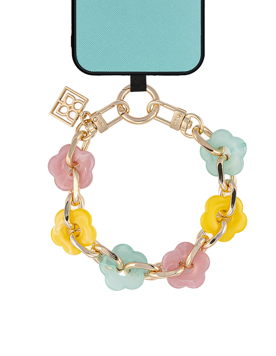 Add a touch of luxury and playful charm to your daily essentials with the LANÉJ Wristlet— a stylish multifunctional accessory designed to keep your phone close or to add charm to your bag! Crafted with eye-catching floral resin links and premium gold hardware, this wristlet is the perfect blend of elegance and function.